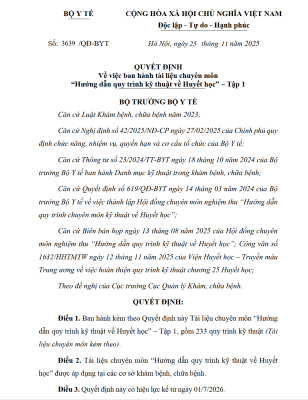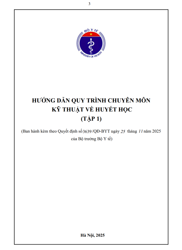 Quyết định số 3639/QĐ-BYT về ban hành Tài liệu chuyên môn Hướng dẫn quy trình kỹ thuật về Huyết học – Tập 1 (2025)