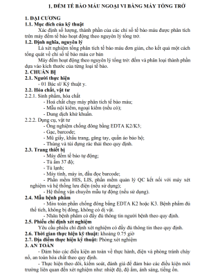 Tài liệu này là Hướng dẫn quy trình kỹ thuật về Huyết học (Tập 1) do Bộ Y tế ban hành, bao gồm 233 quy trình chuyên môn áp dụng tại các cơ sở y tế từ ngày 01/7/2026. Nội dung tập trung vào các tiêu chuẩn kỹ thuật chi tiết cho xét nghiệm tế bào máu, đông cầm máu, miễn dịch huyết học và truyền máu. Các nguồn tin cung cấp hướng dẫn cụ thể về nguyên lý, các bước thực hiện và cách xử trí sai sót cho nhiều phương pháp từ thủ công đến tự động hiện đại như Flow Cytometry hay Realtime PCR. Ngoài ra, văn bản còn quy định chặt chẽ về việc điều chế các chế phẩm máu, sàng lọc các tác nhân lây truyền và đảm bảo an toàn cho người hiến máu. Đội ngũ biên soạn gồm nhiều chuyên gia đầu ngành nhằm chuẩn hóa chất lượng chẩn đoán và điều trị các bệnh lý huyết học trên toàn quốc.
